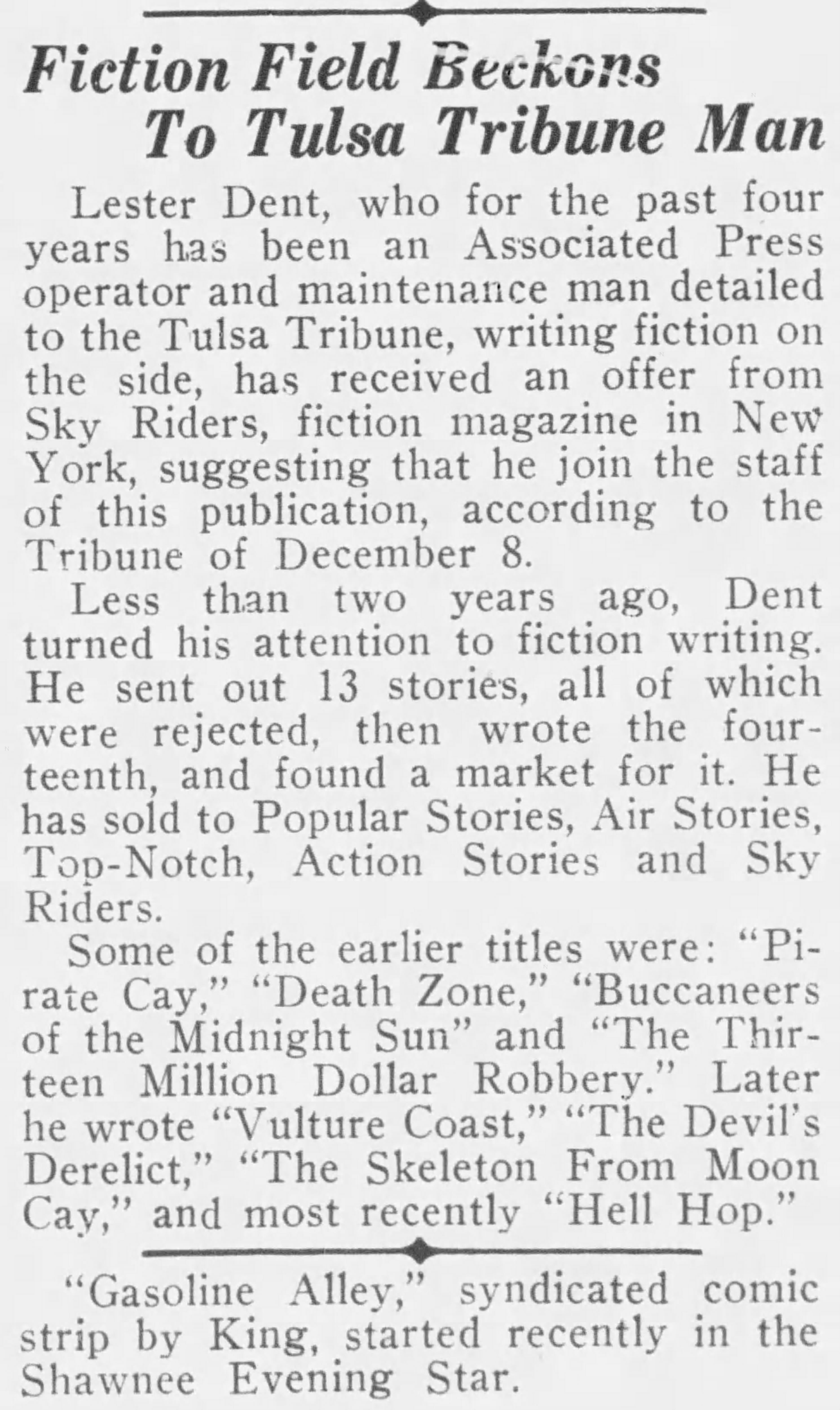 Lester Dent, who for the past four years has been an Associated Press operator and maintenance man detailed to the Tulsa Tribune, writing fiction on the side, has received an offer from Sky Riders, fiction magazine in New York, suggesting that he join the staff of this publication, according to the Tribune of December 8.