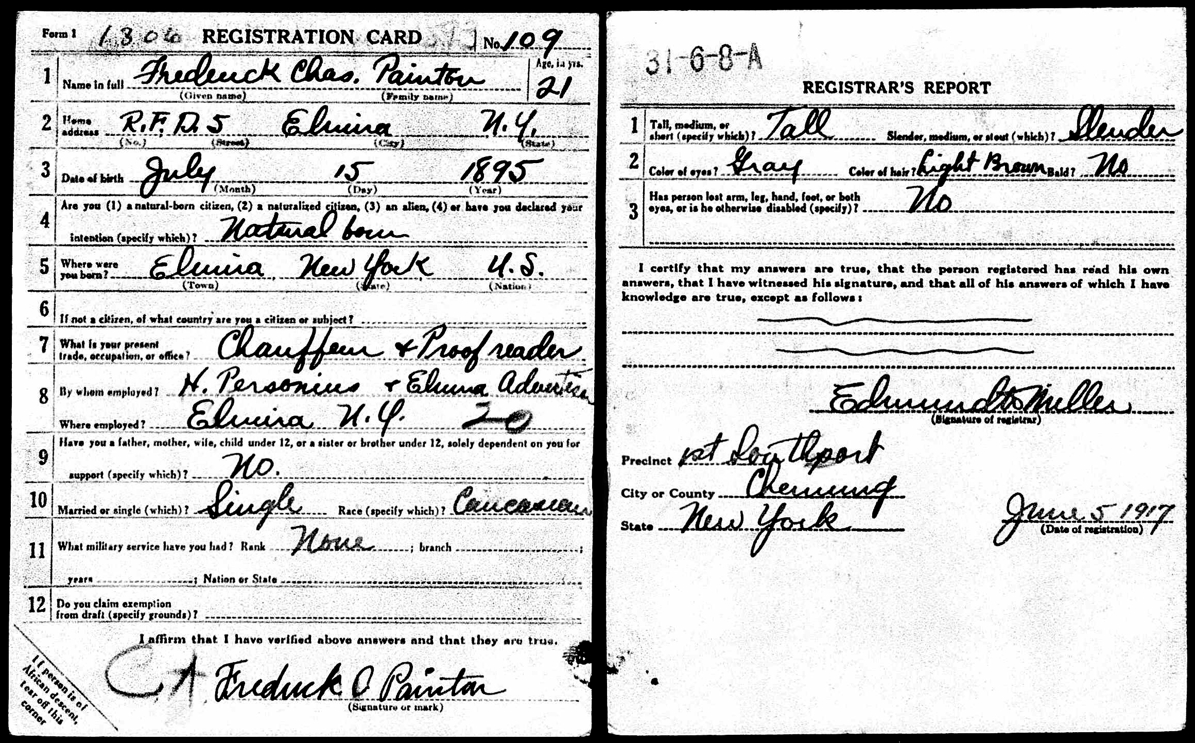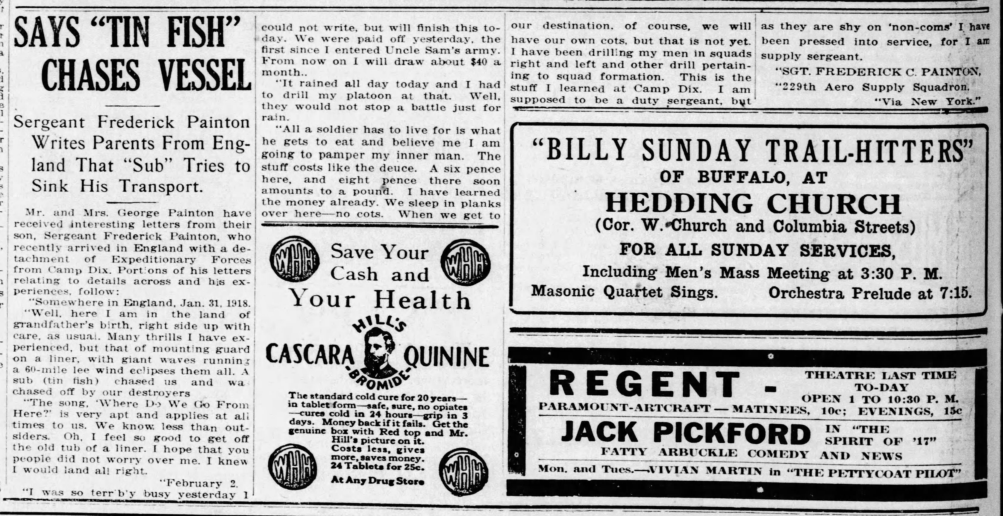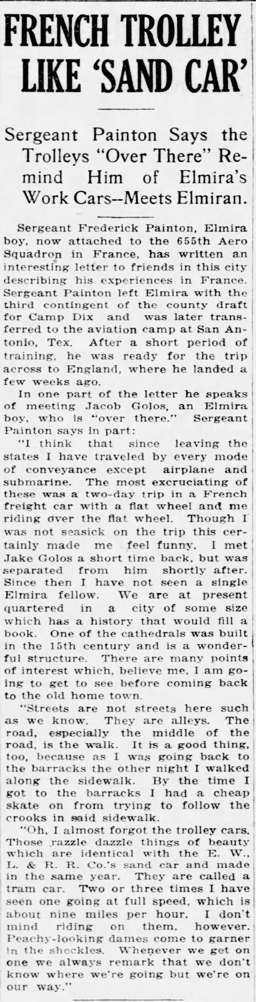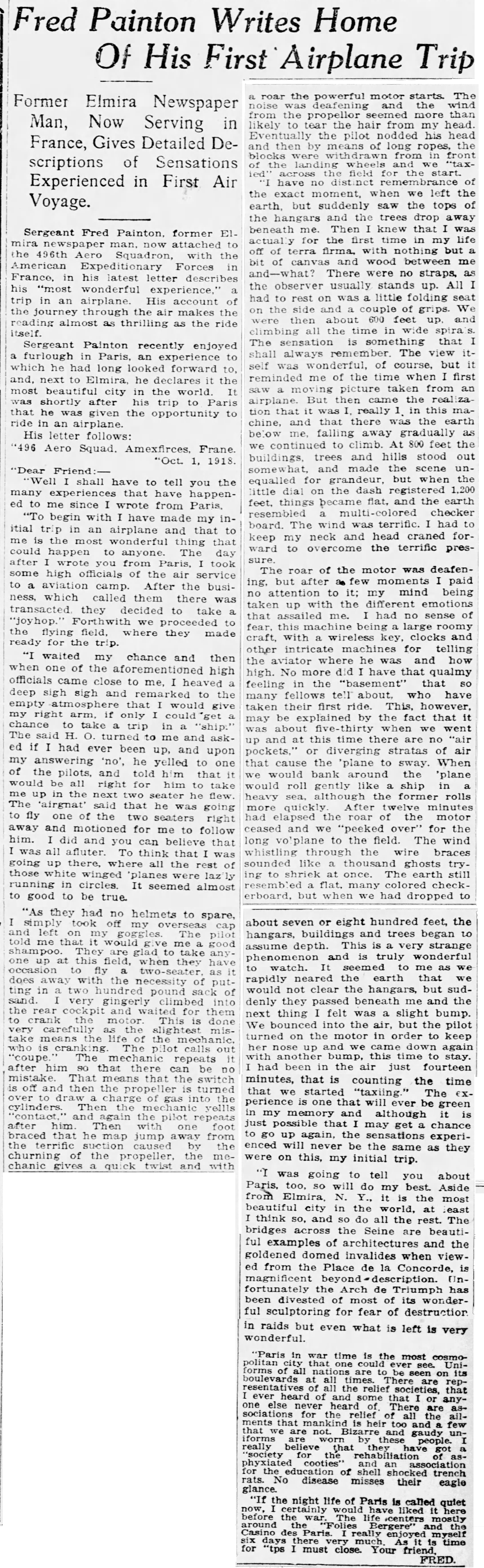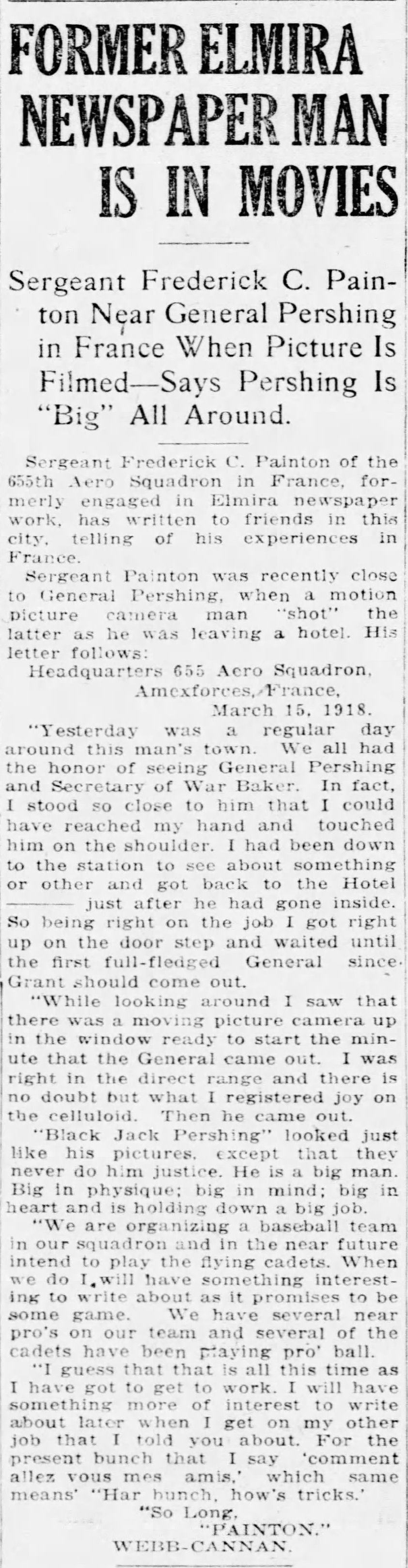 Painton was a reporter in Elmira at the time the United States entered the war. He was eager to get into the scrap, but was continually turned down because of a slight heart affliction. He was not accepted in the draft without an argument, and so eager was he to go that he prevailed upon the draft board to permit him to report ahead of his time. He was again rejected at Camp Dix, but finally was allowed to go to Kelly Field as a chauffeur, and in a few weeks’ time was on his way across in the transport service with an aviation section.