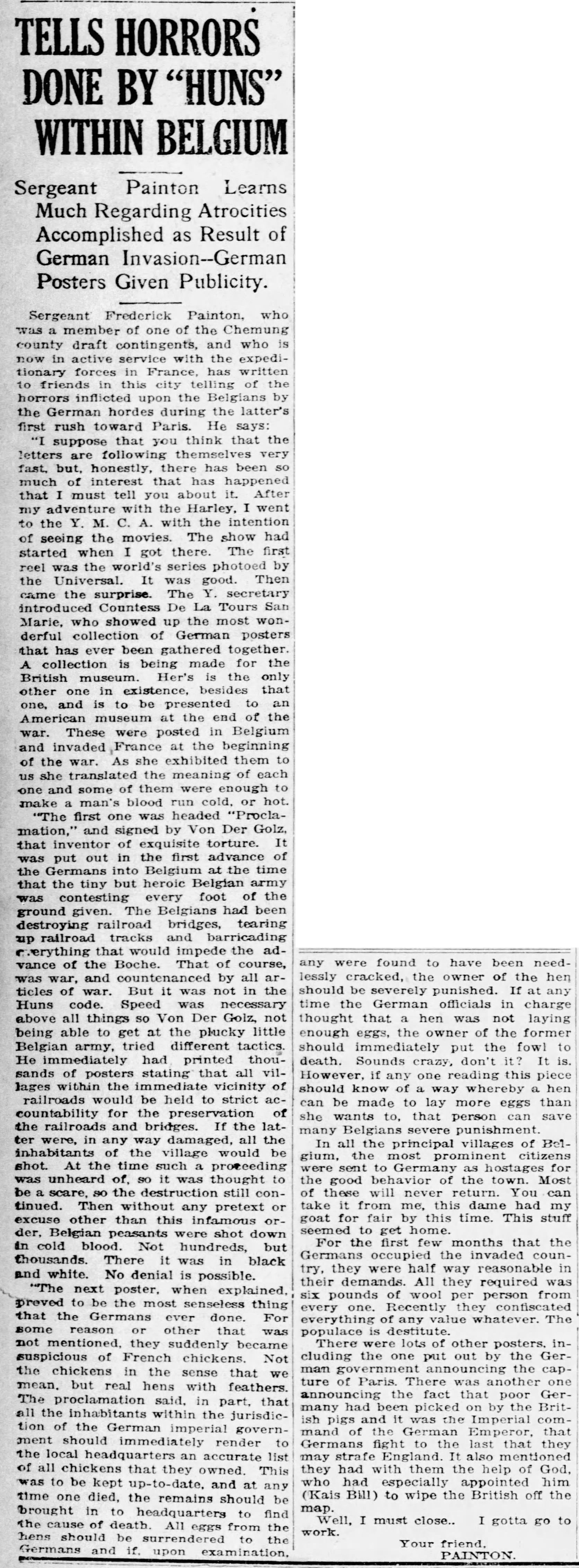 He writes: “A year ago today I landed in Glasgow, England, and now, on the anniversary, I find myself scrapped, war’s cast-off and en-route home.” Painton was gassed several months ago. and at the time paid no attention to the matter. He says “now I am getting the real effects, my stomach is gone, my nerves are gone, and, as you know, I already had a bad heart, so here I am feeling as bad as the Kaiser. I expect to sail in about a week and should be in Elmira by the first of March.”