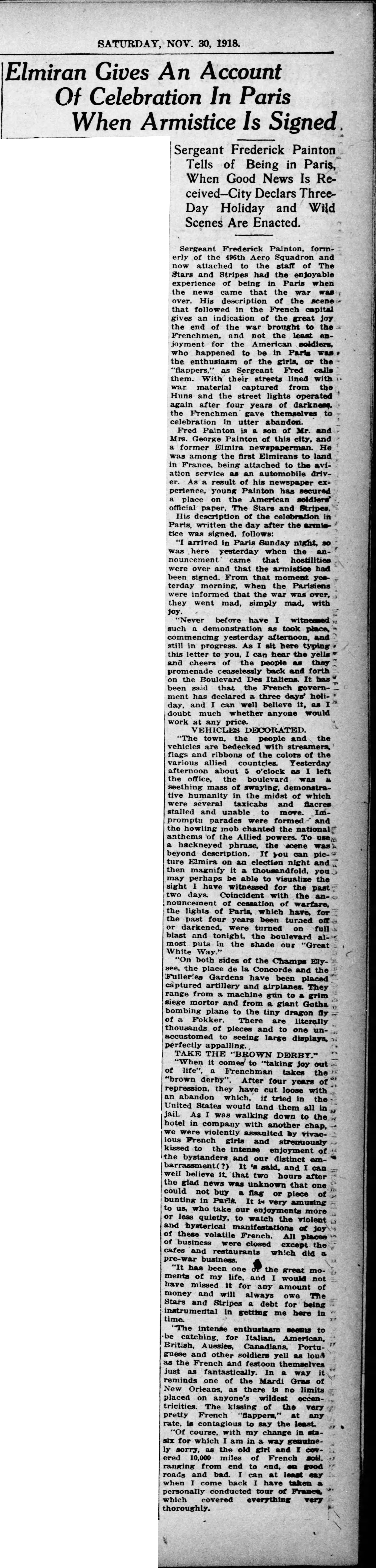 Sergeant Frederick C. Painton, son of Mr. and Mrs. George Painton, former Elmira newspaperman, whose interesting letters from France have been widely read, is enroute home, suffering from the effects of gas, which he received during the St. Mihiel drive by General Pershing’s troops. Painton has lately been attached to the staff of The Stars and Stripes and was having a most interesting experience as a reporter with the American Army of Occupation when he suddenly collapsed and was forced to give up his work.