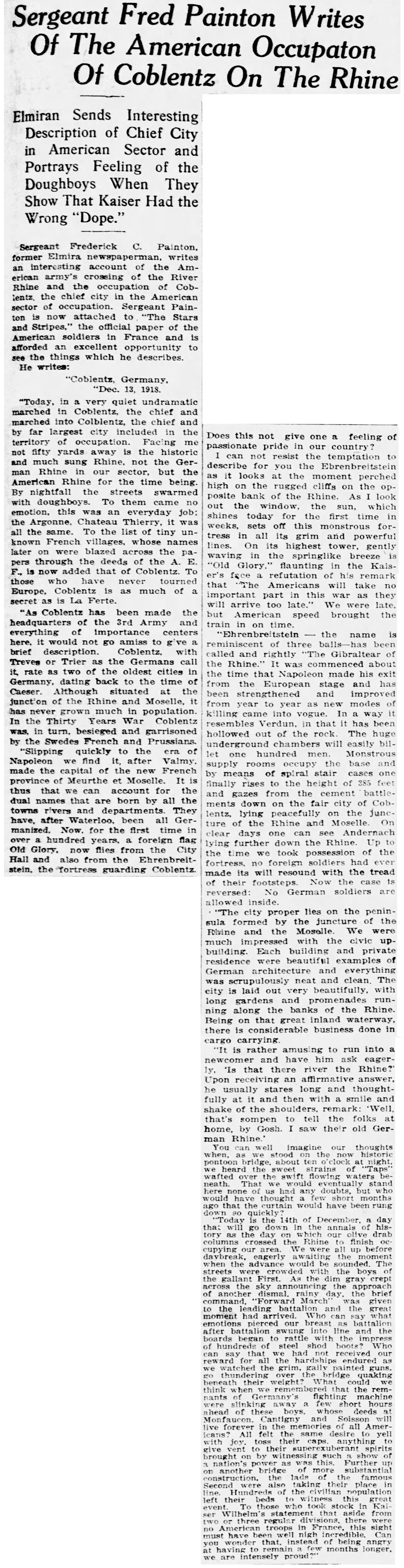 Sergeant Frederick C. Painton, former Elmira newspaperman, writes an interesting account of the American army’s crossing of the River Rhine and the occupation of Coblentz. the chief city in the American sector of occupation. Sergeant Painton is now attached to “The Stars and Stripes,†the official paper of the American soldiers in France and is afforded an excellent opportunity to see the things which he describes.