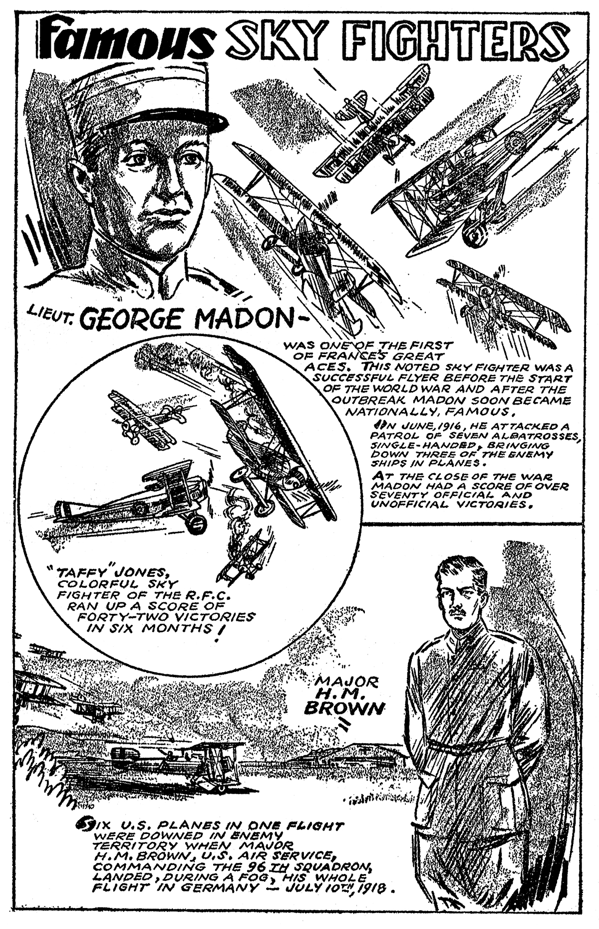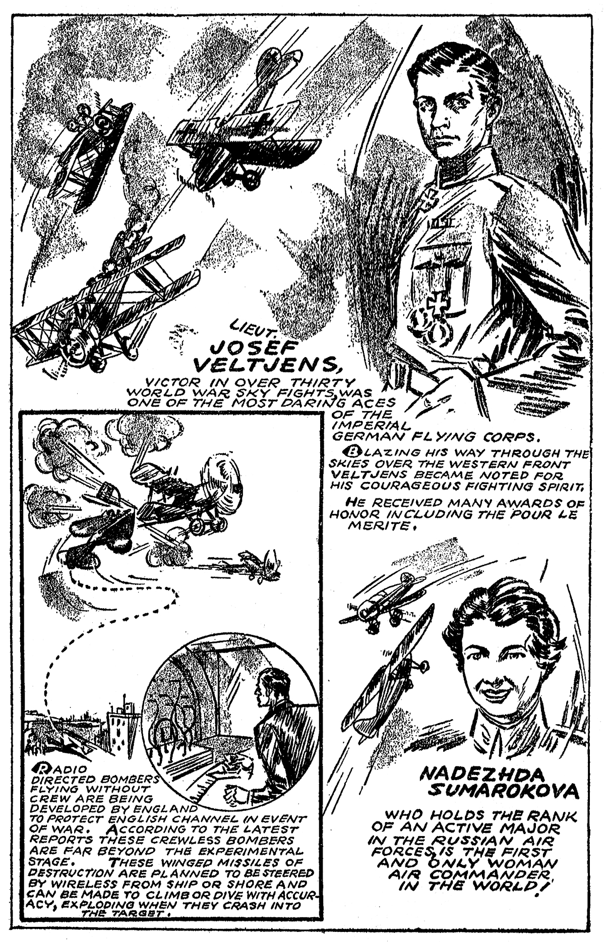 The May 1935 installment, from the pages of Sky Fighters, Features Lt. Georges Madon, Major H.M. Brown, Lt Josef Veltjens, and the world’s first air commander—Nadezhda Sumarokova!