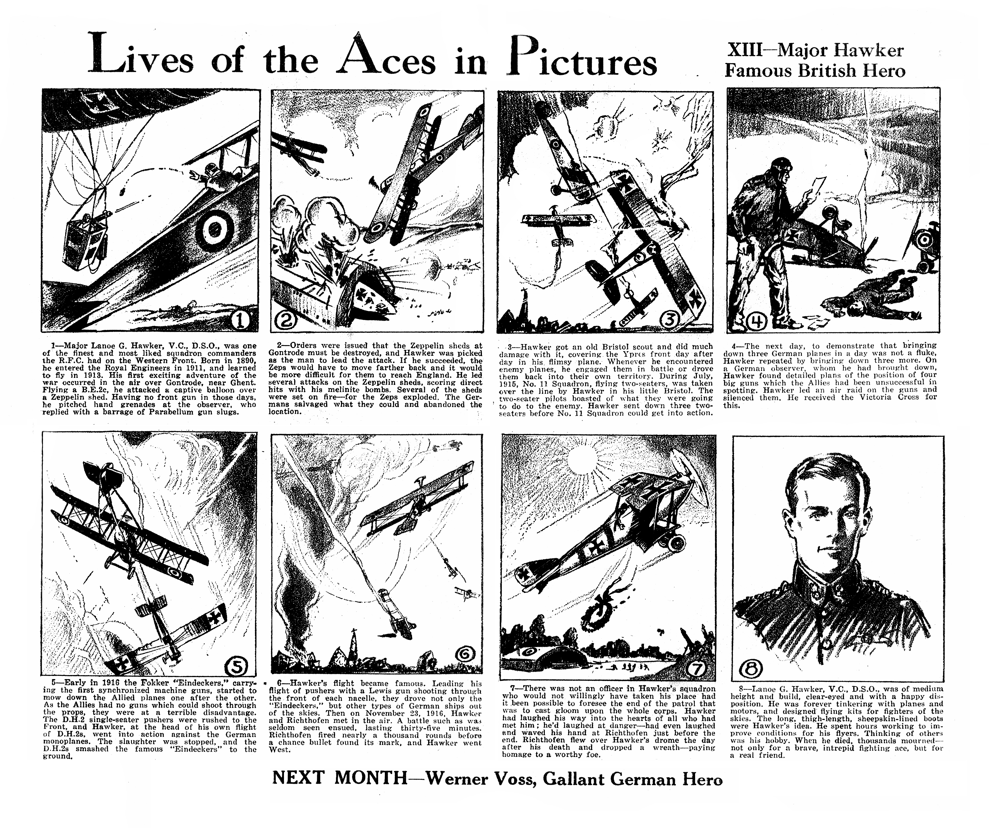 Starting in the May 1932 issue of Flying Aces and running almost 4 years, Eugene Frandzen’s “Lives of the Aces in Pictures” was a staple of the magazine. Each month Frandzen would feature a different Ace that rose to fame during the Great War. This time around we have English Ace—Major Lanoe G. Hawker!