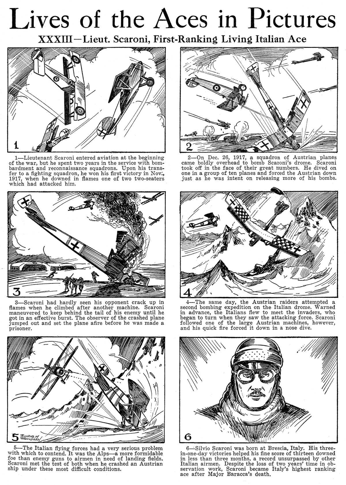 with 26 victories and an additional six unconfirmed! He is beat by the great Francesco Baracca who is credited with 34 victories, but Baracca did not survive the war. Scaroni did and went on to help establish a flying school for the Chinese Air Force at Loyang and set up an aircraft plant to produce Fiat fighters and Savoia-Marchetti bombers under license.
