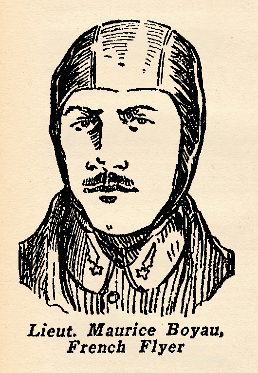 ranking ace. Fonck, Guynemyer, Nungesser and Madon, all ranked above him in actual victories scored. Maurice Boyau combined all the best qualities of these four aces and wan in addition the most ingenious. If death had not cut short his flaming career long before the war ended, it is very possible that he might have attained the honor of being France’s ace of aces, for he had every qualification for that distinction. He was struck down when he had run his 35 victories, but not before he had won every medal within the power of his native country to bestow. These Included the Legion d’Honneur, Medaille Militaire and the Croix da Guerre, with numerous stars and palms. The following story taken from his diary gives a striking and vivid example of his ingenuity. The translator has made no attempt to polish the language of Boyau’s script, feeling that to do so would take away from the charming simplicity of the document.