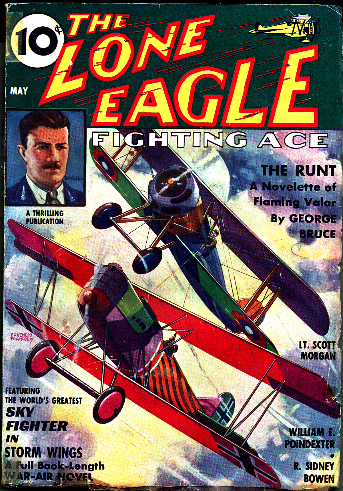 Eugene M. Frandzen painted the covers of The Lone Eagle from its first issue in September 1933 until the June 1937 issue when he would share duties with Rudolph Belarski. At the start of the run, Frandzen painted covers of general air action much like his Sky Fighters covers, shifting to covers featuring famous aces at the end of 1935. For the May 1936 issue, Frandzen gives us a Nieuport 28 and Pfalz D3 locked in combat!