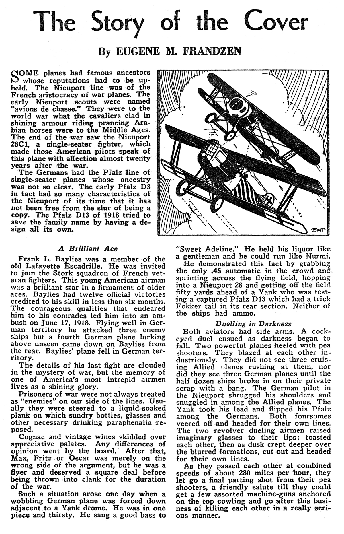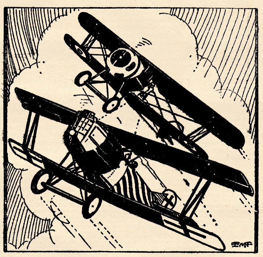 Both aviators had side arms, A cockeyed duel ensued as darkness began to fall. Two powerful planes heeled with pea shooters. They blazed at each other industriously. They did not see three cruising Allied planes rushing at them, nor did they see three German planes until the half dozen ships broke in on their private scrap with a bang. The German pilot in the Nieuport shrugged his shoulders and snuggled in among the Allied planes. The Yank took his lead and flipped his Pfalz among the Germans. Both foursomes veered off and headed for their own lines. The two revolver dueling airmen raised imaginary glasses to their lips; toasted each other, then as dusk crept deeper over the blurred formations, cut out and headed for their own lines.