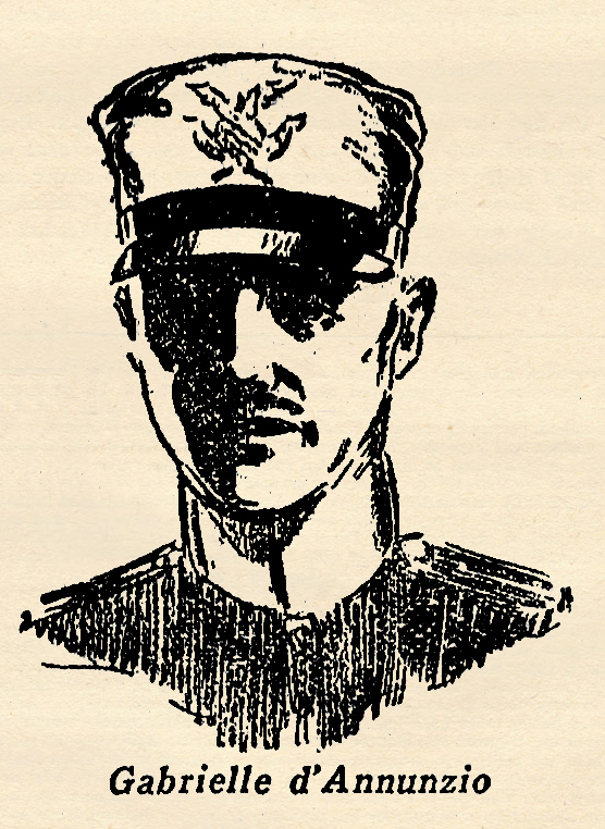 famous Italian poet and dramatist and enthusiastic patriot, was one of the most colorful and forceful of Italian flyers in the early days of the World War. He enlisted early in the most spectacular branch of the army, the Italian Air Corps. Soon after completing his training he was assigned to a bombardment squadron which was charged with harassing the then fast-advancing Austro-German armies, which threatened to overwhelm the brave Italian defenders and take the capitol at Home. By exerting superhuman efforts the Italians prevented that.