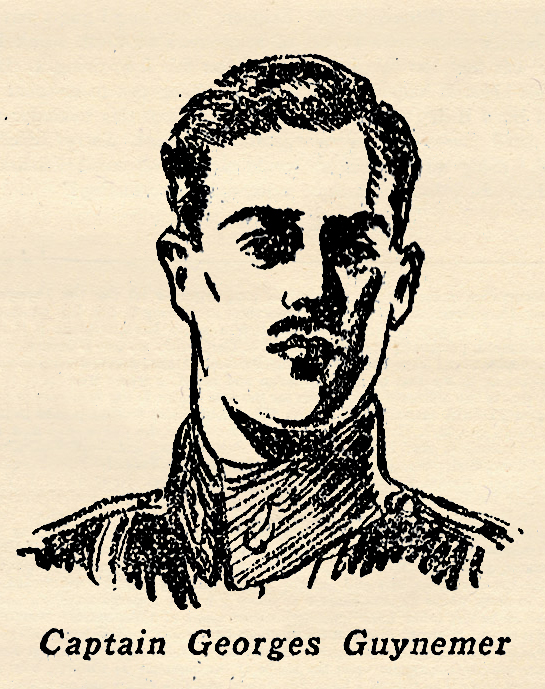French flier, was the moat spectacular and colorful of all the flying Aces. Young, tall, slender, but in very poor physical health, he was a veritable demon in the air, He had absolutely no regard for his own personal safety. Time after time be attacked single-handed whole squadrons of enemy planes. On the ground he was shy, reserved, and spoke very few words to anyone. Whenever he came to Paris on his very infrequent leaves from the front to secure medical aid, the whole city was decorated in festive attire in his honor. He was the toast of the boulevards, the darling of the French populace. And the whole world mourned his passing when he died, shot down by a comparatively obscure German pilot, who got in a chance shot from exceedingly long range. The German pilot, Wisseman, never knew until afterward that it was the great Guynemer that he had shot down. When Guynemer passed mysteriously into the blue, he was officially credited with 57 enemy aircraft and universally recognized as the Ace of Aces of all the armies.