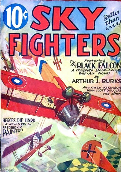 a story from the pen of a prolific pulp author and venerated newspaper man—Frederick C. Painton. In “Heroes Die Hard” Painton crafts a story of an immoral politician trying to use his carefully created war record to sweep him in to office when the war is over. The only problem is a man he wronged in the past who now stands in the way of his future! From the October 1933 issue of Sky Fighters, it’s “Heroes Die Hard!”