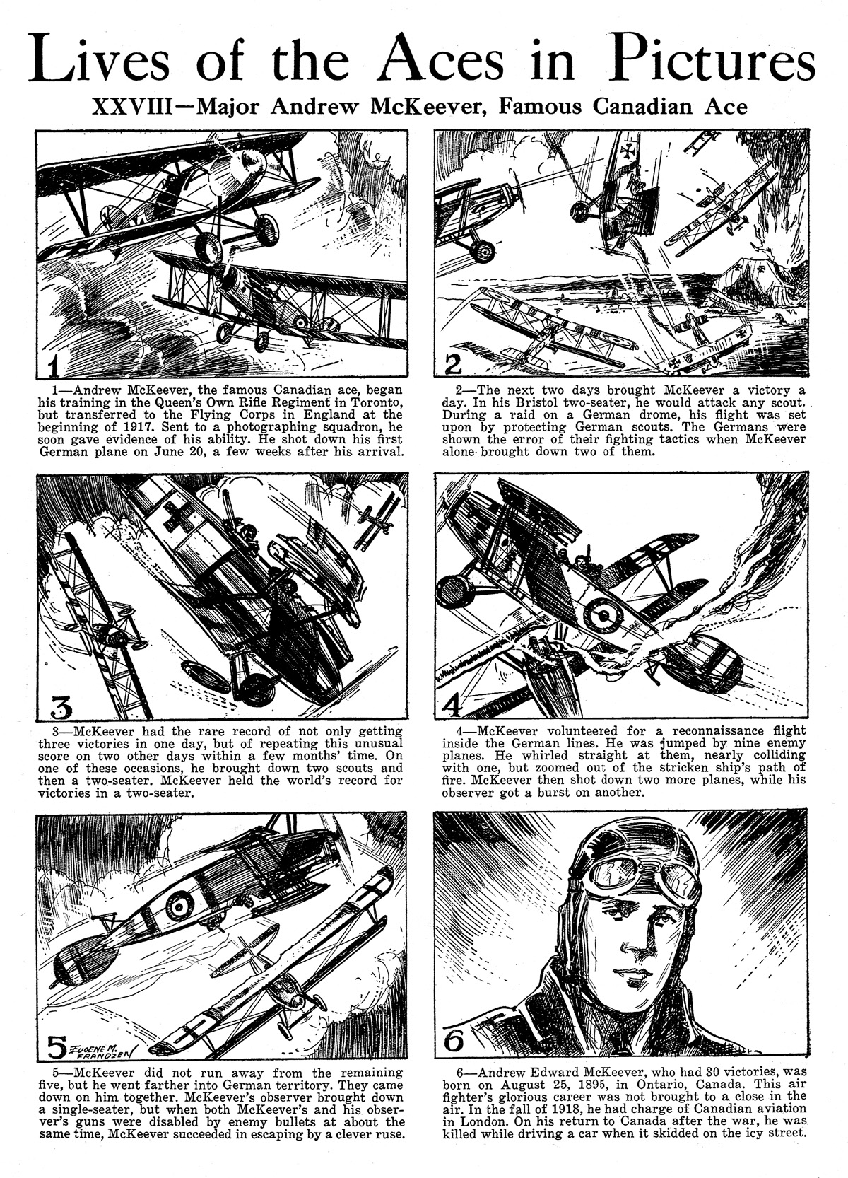 Here’s another of Eugene Frandzen’s “Lives of the Aces in Pictures” from the pages of Flying Aces Magazine. The series ran for almost four years with a different Ace featured each month. This week we have the his illustrated biography from the October 1934 issue, that famous Canadian Ace—