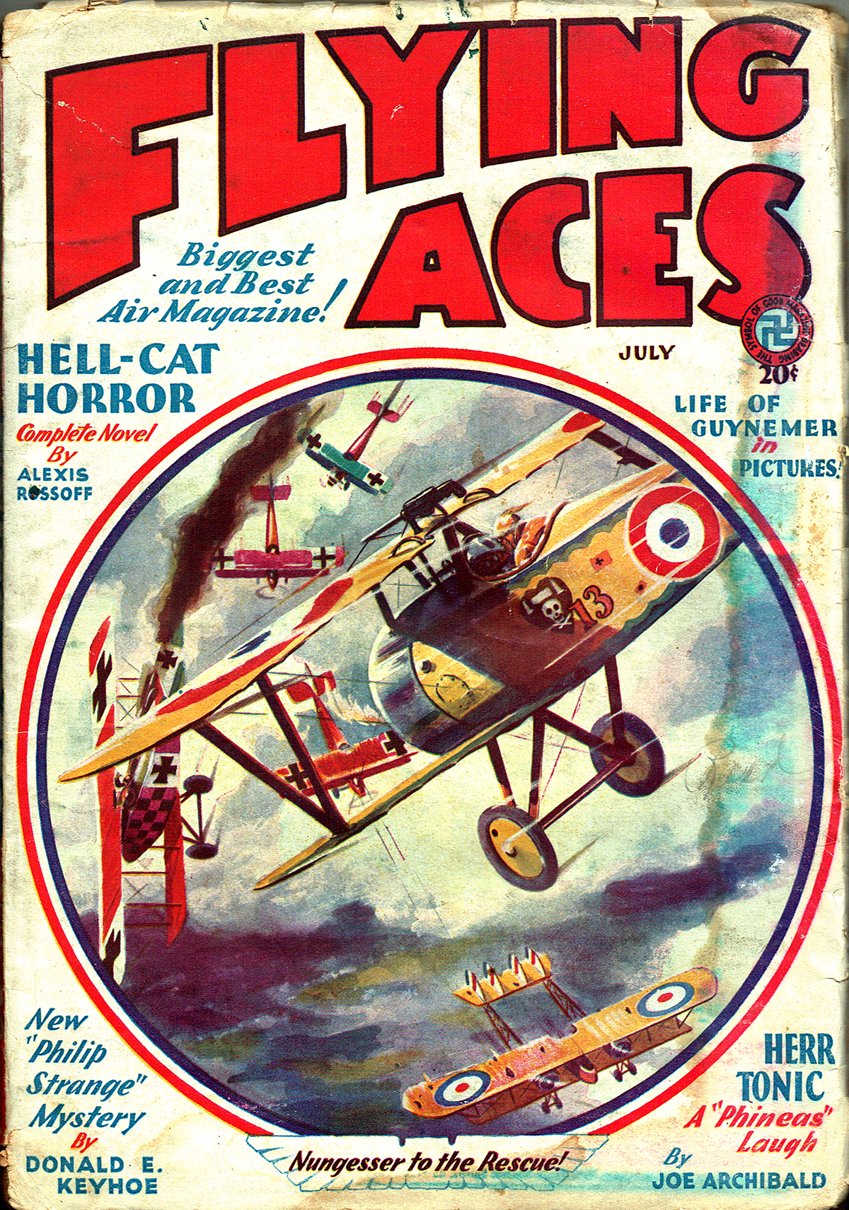 Phineas Pinkham meets his match when the 9th Pursuit’s latest replacement in the form of one Lieutenant Monk Flanagan, once known as Perfesser Merlin the Great of the Hipperdrome Vodyville Circuit, arrives. Poor Phineas gets a taste of his own medicine—he can certainly dish it up, but can he take it? Find out in Joe Archibald’s latest Phineas mirthquake, “Pride of the Pinkhams” from the May 1932 Flying Aces.