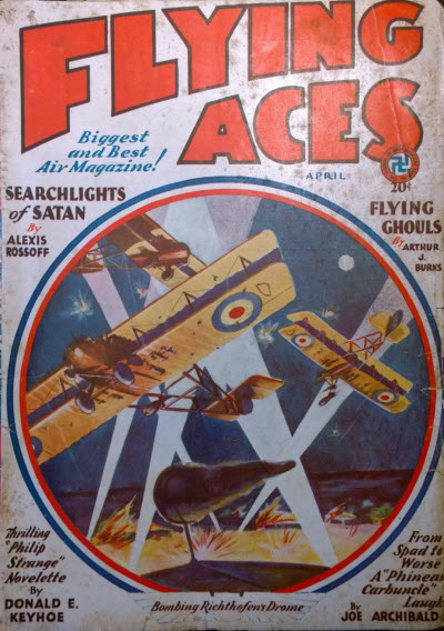 ‘ . . . he knew a fiend had turned his pals into a Squadron of Living Death. He knew that the remedy lay in a will to fight and fight and fight . . . a low, vibrant chuckle left the lips of G-8 . . . the Master Spy shot his fist up in a signal to the Battle Aces . . . the Spad howled up in a steep climb . . . Fokkers thundered from the sky . . . tac-tac-tac! the machine guns clattered a hymn of hate . . . tac-tac-tac! tac-tac-tac!