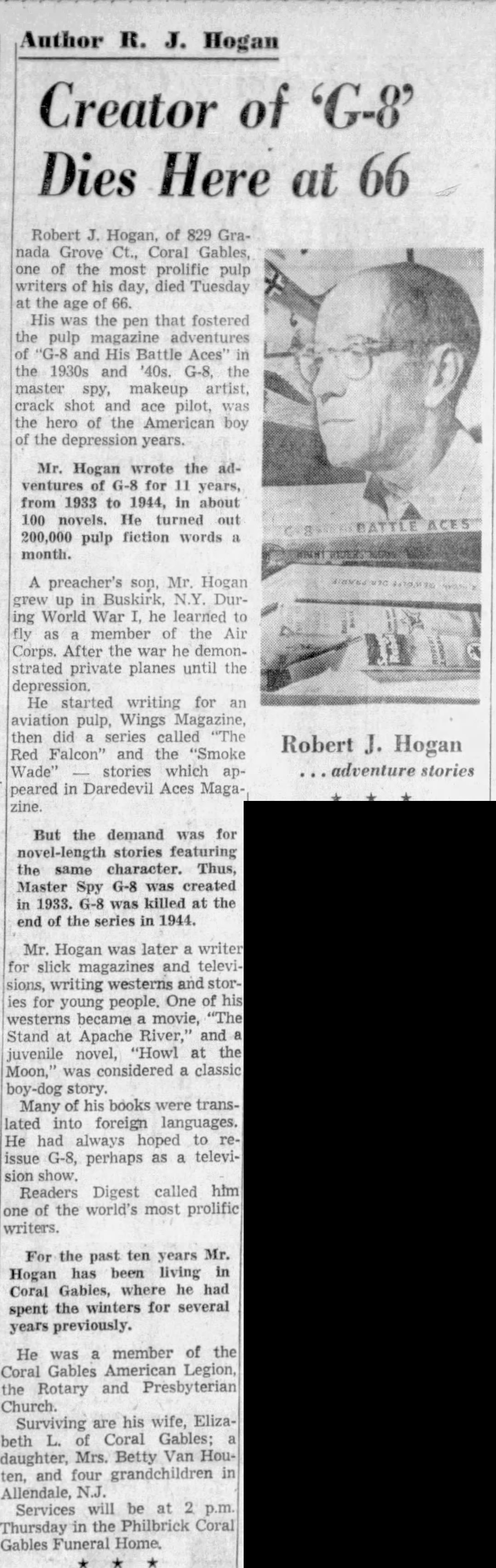 Hogan has slowed a bit lately. He and his wife Betty, winter in Coral Gables, summer in New Jersey. But the typewriter still clatters though the pace has relaxed. What Hogan would like to do now is re-issue G-8 in some form or other, for nostalgia fans maybe make G-8 a TV show.