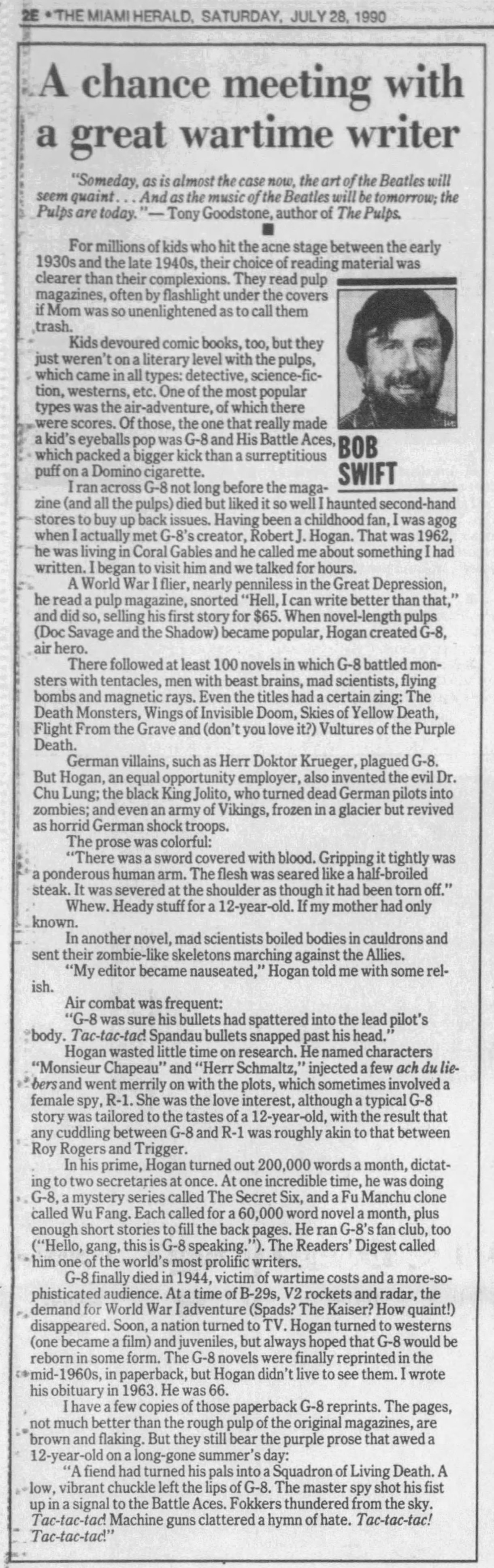 correspondence between Henry Steeger, Robert J. Hogan, and Bob Swift that Pulp Historian Don Hutchison handed us at PulpFest. The letters with Bob Swift concerned a feature article he was writing for the Miami Herald Sunday Magazine. Although Don had given us the letters, the package did not include the Miami Herald Sunday Magazine feature story. But thanks to Newspapers.com, we have finally got a copy of it to share with our readers.
