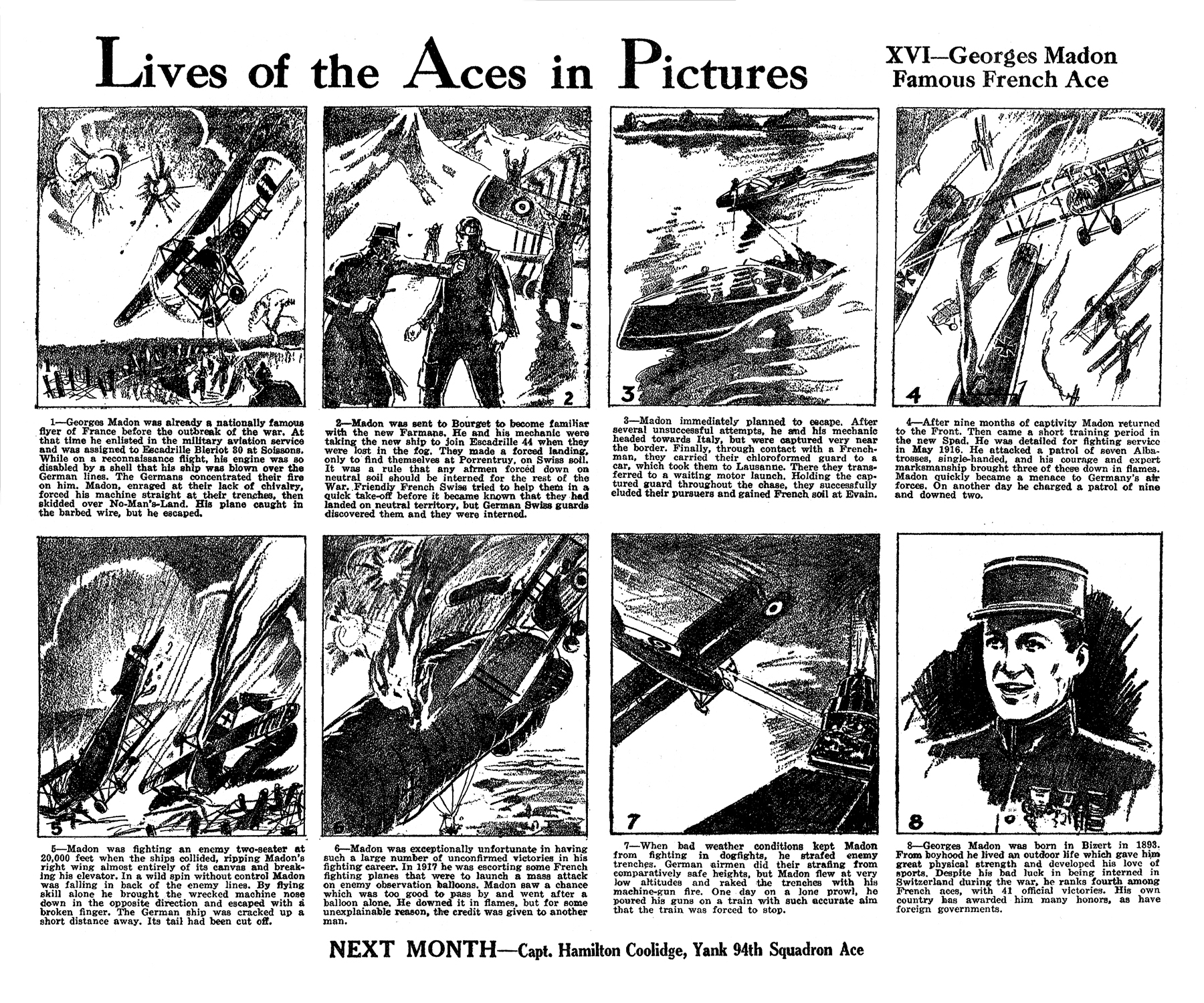 was one of the most famous of the French flying aces. Along with Guynemer, Navarro and Nungesser, he furnished the spectacular flying news that filled the newspapers in the early days of the World War. He was credited with forty-one victories—only the great Guynemer topped him in the list of French aces during his time on the battle front—and awarded the Legion d’Honneur, Medaile Militaire, and Croix de Guerre.