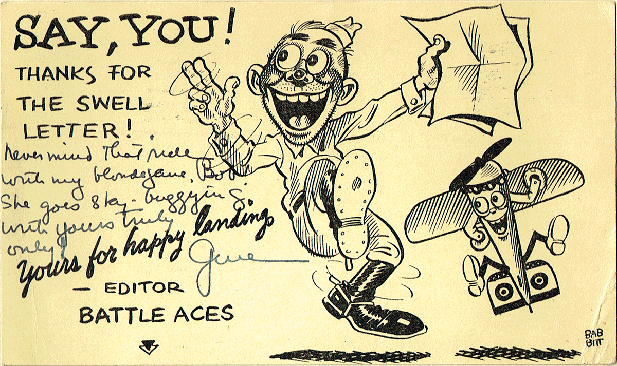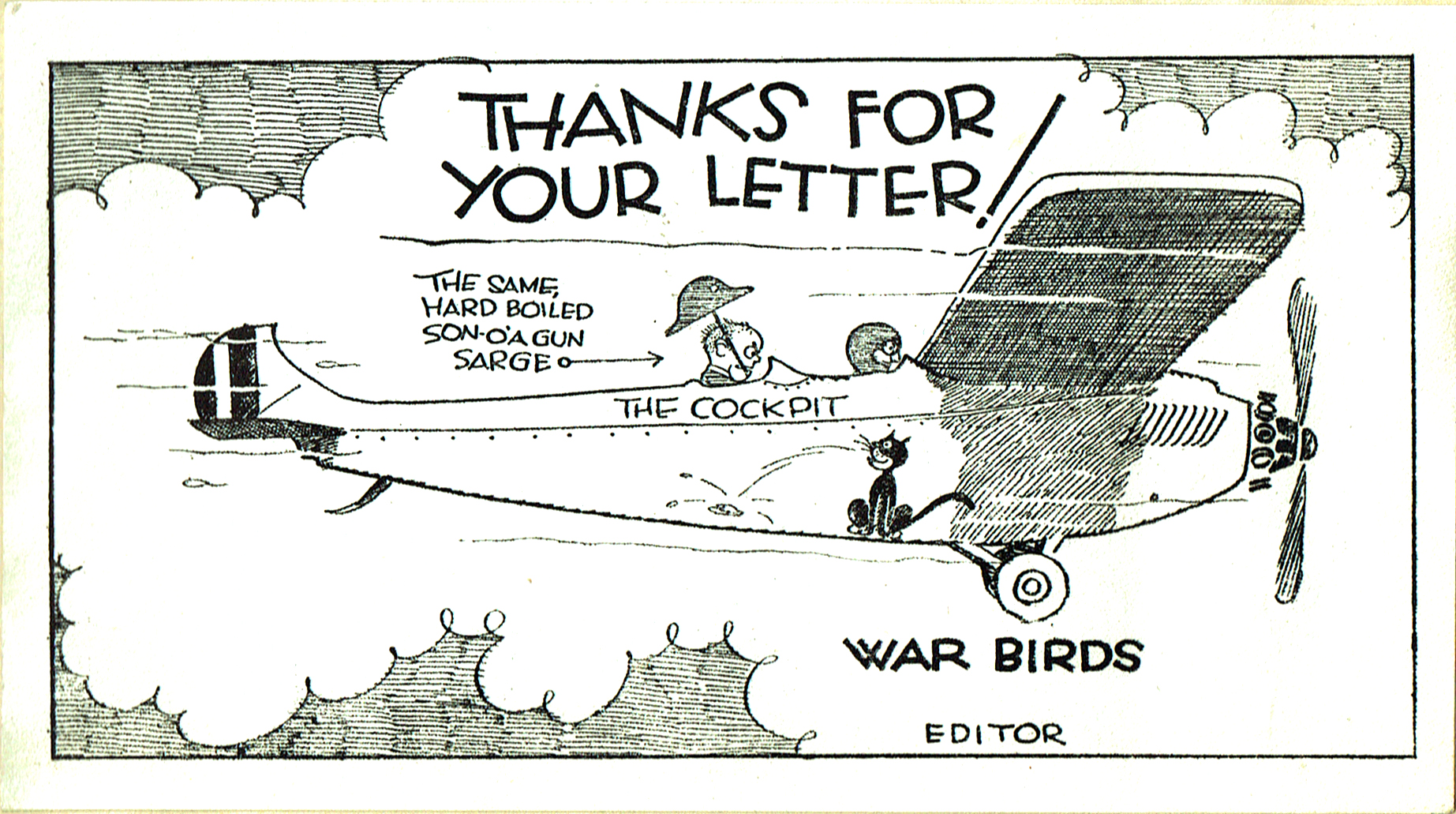 The second is from War Birds magazine. Unlike the Battle Aces card, this is not a postcard, just a slip of paper and was most likely sent in an envelope. It pictures that “same hard boiled, son-o’a gun, Sarge” reading letters while being flown about and says simply: “Thanks for your Letter!”