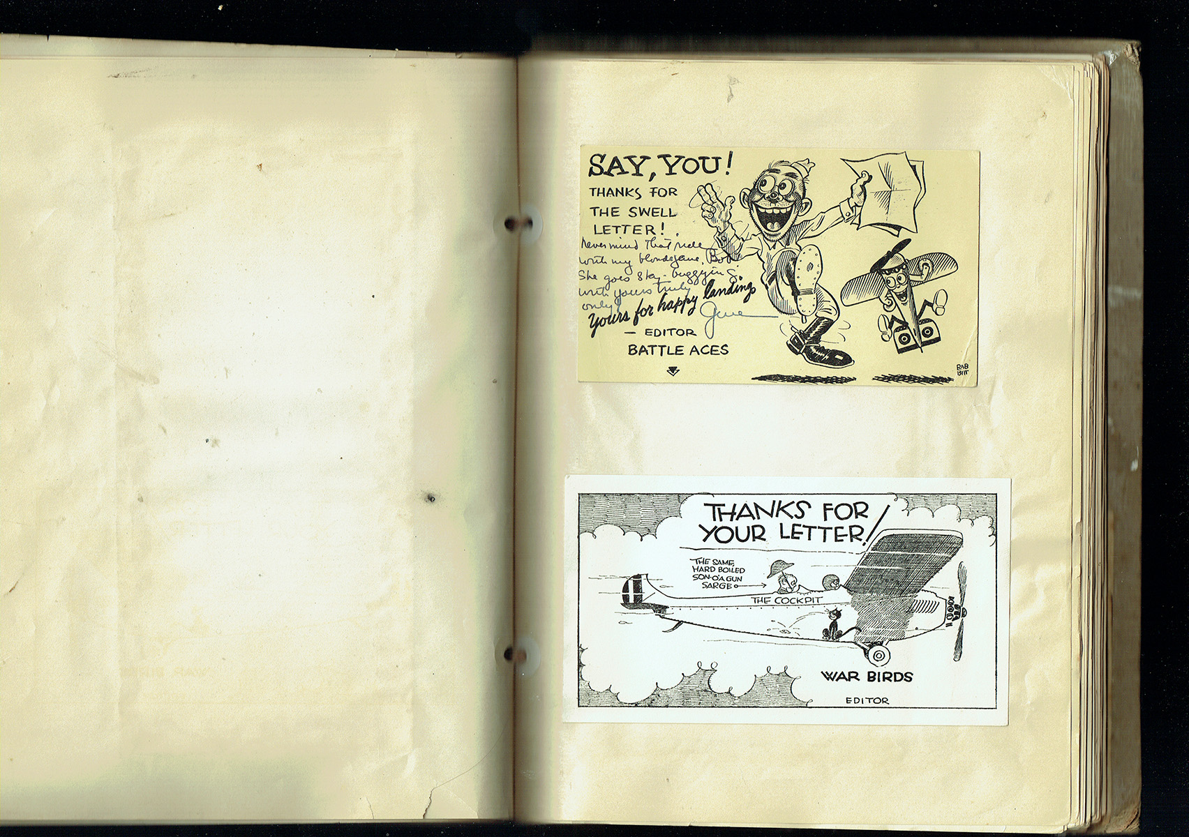Opening it, we find a letter from “Sarge” on the official Popular Publications letterhead. Sarge was the assumed character and nom de plum of Eugene A. Clancy that he used for answering letters sent into Battle Aces magazine’s letters column, The Hot Airdrome.