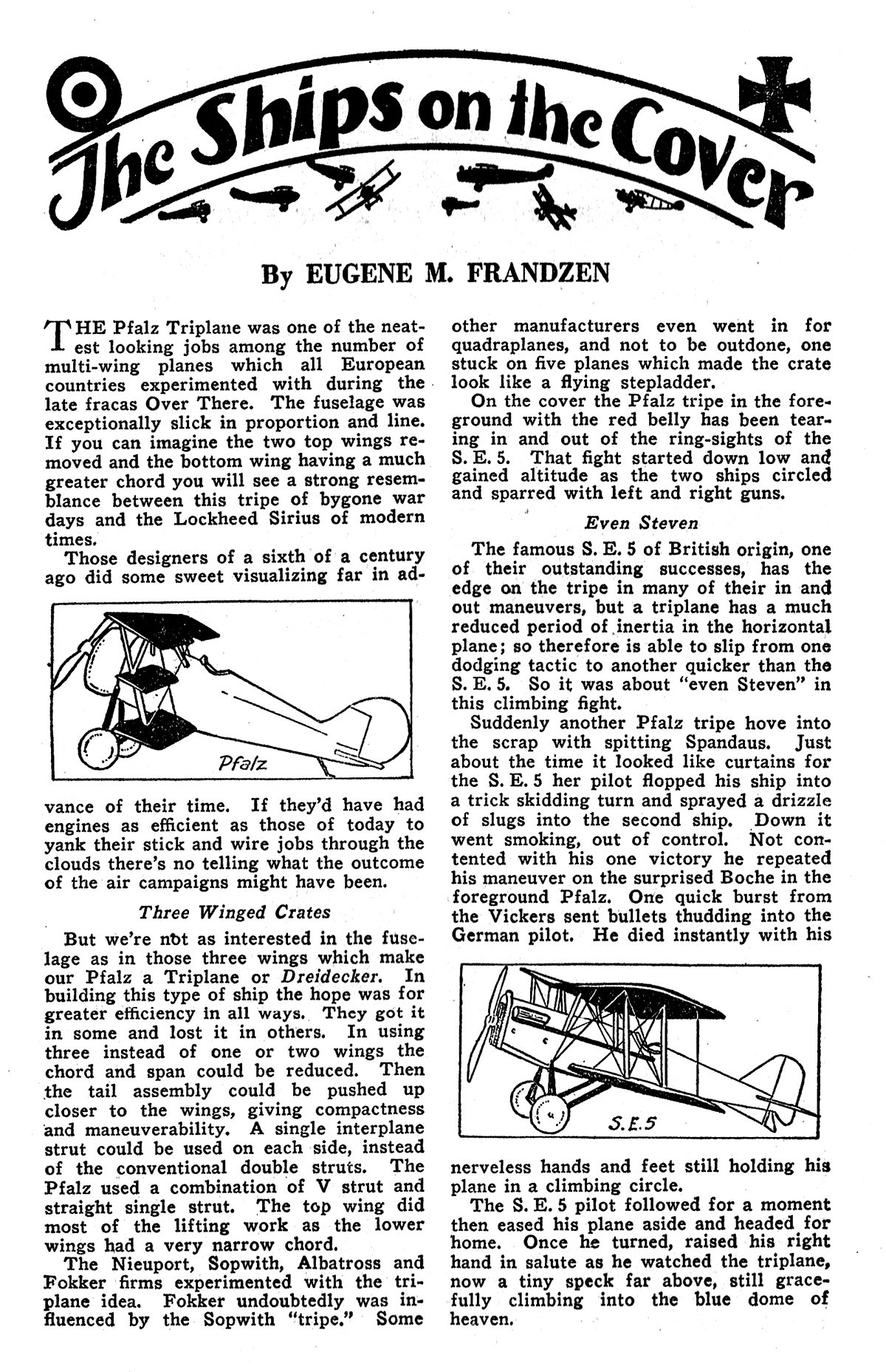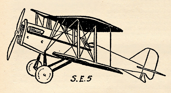 And since I mentioned experimental ships, it looks like a good chance to slip you a bit of information that might come in handy when you are looking at war crates. Whenever you saw a ship and the caption told you it was a Handley-Page S.E. 5, or a something else, R.E. 2, or whatever, did you ever wonder why they strung out that alphabet and numbers after the name of the ship just like a professor with a lot of A.B.’s and X.Y.Z.’s after his name? Well, here’s the dope.