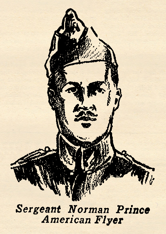 France when the World War began. Being immensely wealthy in his own right, he offered to furnish and equip an entire squadron of planes and pilots. The French Army would not accept this generous offer, but Prince, acting in co-operation with William Thaw of Pittsburgh, convinced the officials that they could muster enough Americans to man an entire squadron. Their offer was accepted, and the LaFayette Escadrille was born. A French officer was put in command. All the rest of the pilots were American. Prince’s death was tragic. Though wounded in an air battle, he managed to fly his crippled plane homeward, and was about to land on his own airdrome in the gathering darkness when his plane ran into a telephone pole and crashed. In his weakened condition he did not have strength enough to guide his plane over or around the obstacle. So perished one of the bravest and most courageous of the early American pilots who gave their lives for France. The story below was told to a French reporter.