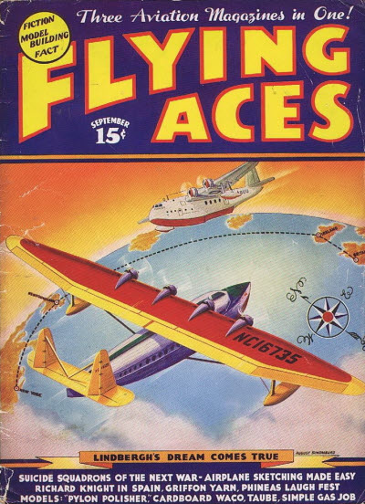On the cover two Boche pilots tangled with a single Nieuport 28 C.1. Both Fokkers had skull and crossbones insignia on their flat fuselages. But it’s superior ships and superior flying that chalks up the score.