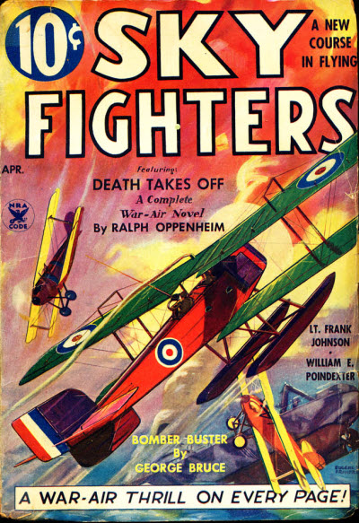 Mosquito Month we have a non-Mosquitoes story from the pen of Ralph Oppenheim. In the mid thirties, Oppenheim wrote a half dozen stories for Sky Fighters featuring Lt. “Streak” Davis. Davis—ace and hellion of the 25th United States Pursuit Squadron—was a fighter, and the speed with which he hurled his plane to the attack, straight and true as an arrow, had won him his soubriquet. Once more it’s a battle against time as Streak must retrieve vital information about Pershing’s big push against Hindenburg that had been left behind in a locked safe when the Boche over ran the villa that had been an Allied held town. From the April 1935 issue of Sky Fighters it’s “Death Takes Off!”