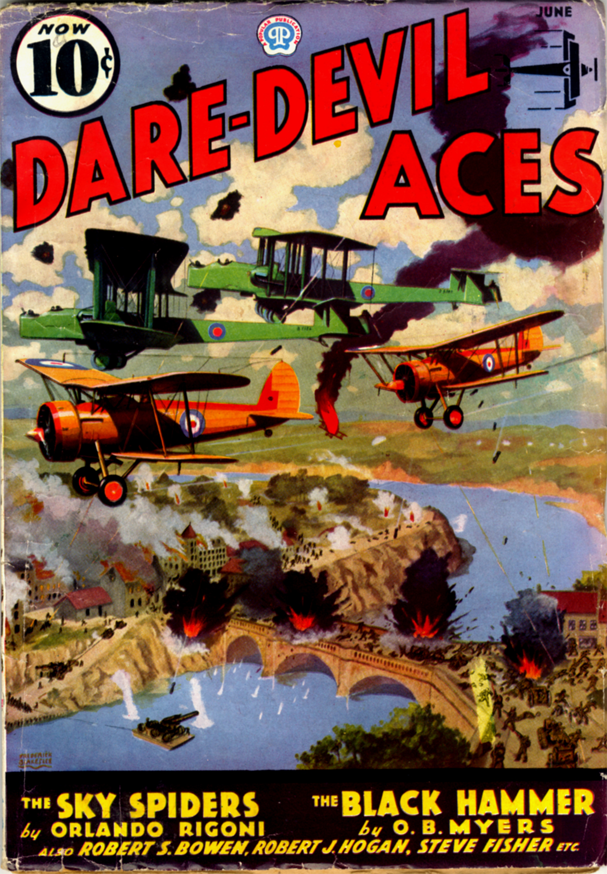 Frederick Blakeslee painted all the covers for the entire run of Dare-Devil Aces. And each of those covers had a story behind it. On Dare-Devil Aces’ June 1936 cover, Mr. Blakeslee has painted a couple of Bristol Bulldogs escorting a flight of Vickers Virginias!