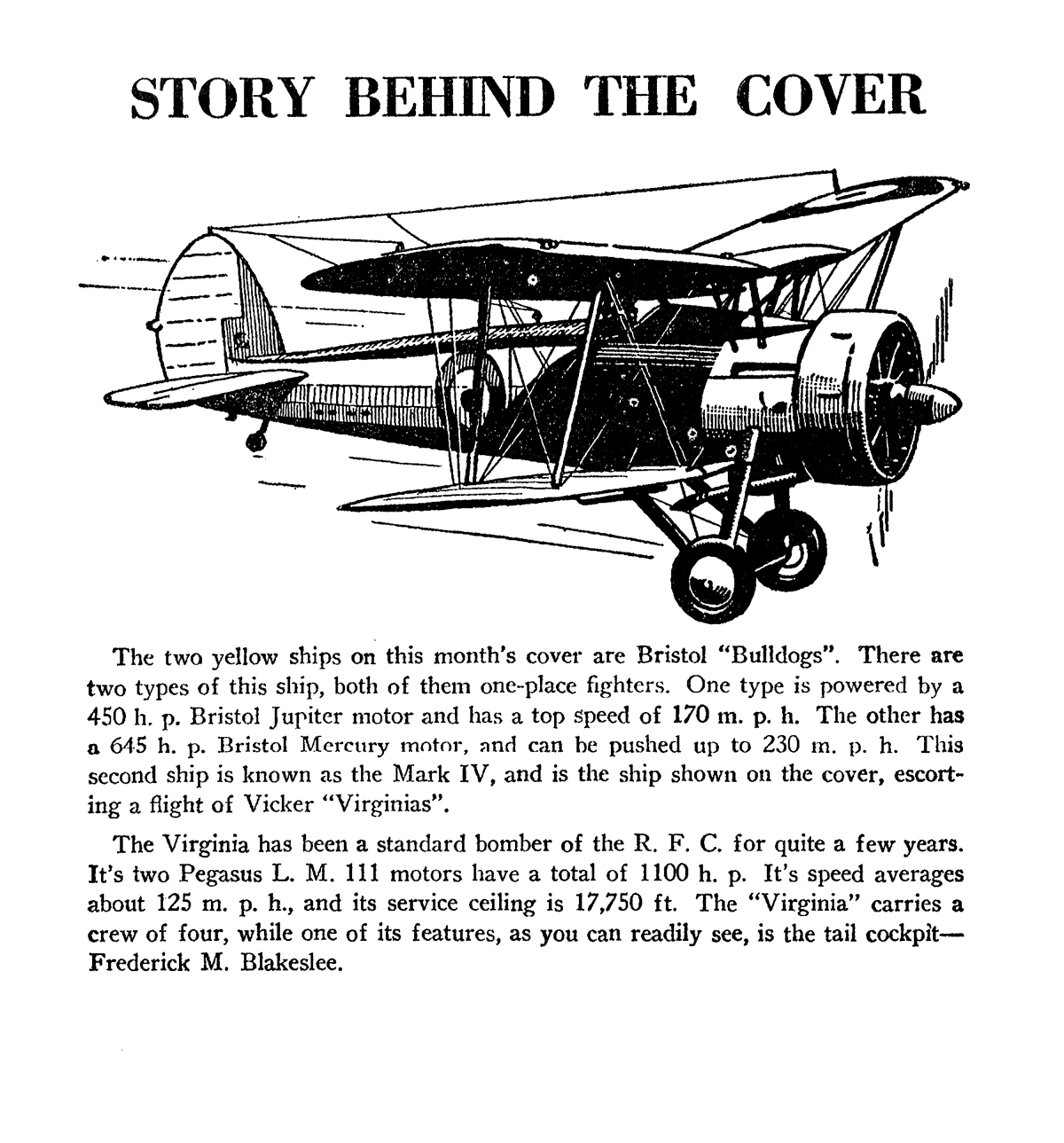 THE two yellow ships on this month’s cover are Bristol “Bulldogs”. There are two types of this ship, both of them one-place fighters. One type is powered by a 450 h.p. Bristol Jupiter motor and has a top speed of 170 m.p.h. The other has a 645 h.p. Bristol Mercury motor, and can be pushed up to 230 m.p.h. This second ship is known as the Mark IV, and is the ship shown on the cover, escorting a flight of Vicker “Virginias”.