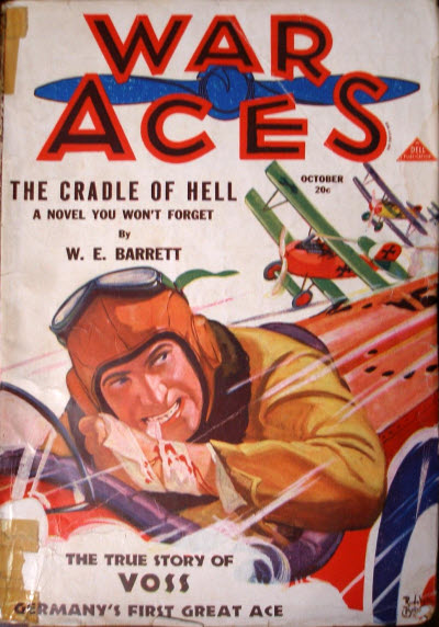 in the January 1932 War Aces—”Unless we misjudge the reading taste of our readers we feel that “Phantom Eagle,†by W. E. Barrett is about the ideal story. It has that balance of action, mystery and fantasy that gives you a new set of thrills. Obviously, it was too bizarre to be entirely fiction, so we asked the author about it. As is the case with most of Barrett’s fiction, it is based on some true incident. Here is his letter: